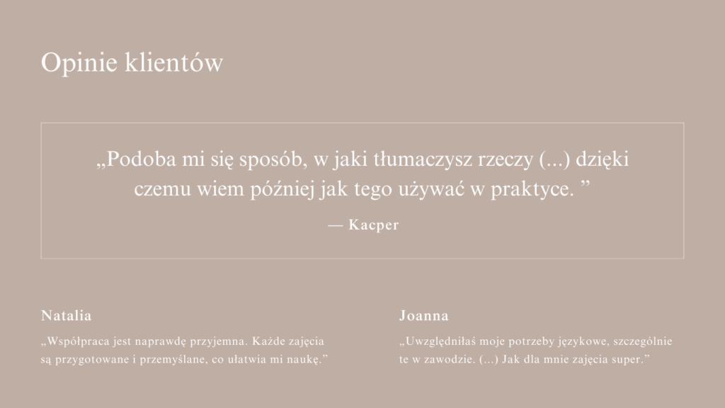 - Kursy angielskiego dla firm – dopasowane do Twojego biznesu, prowadzone przez doświadczonego trenera, który rozumie realia pracy w korporacjach, małych i średnich firmach oraz środowiskach międzynarodowych.