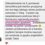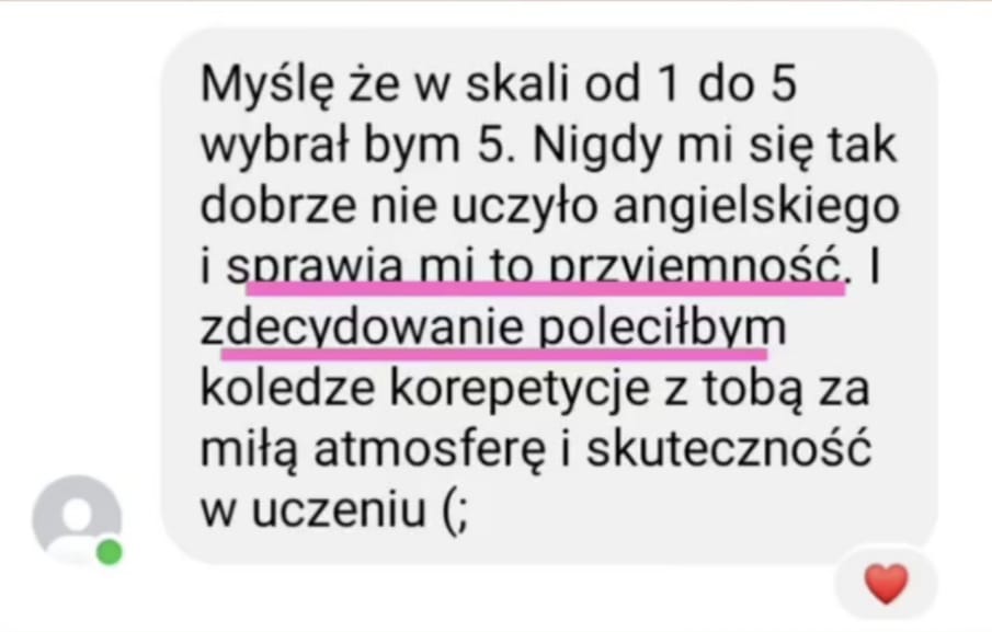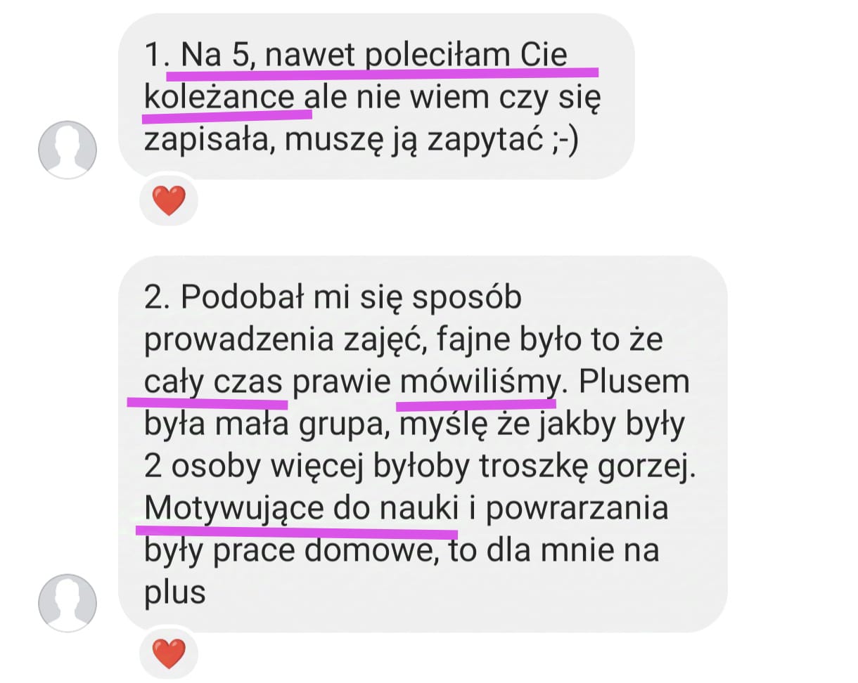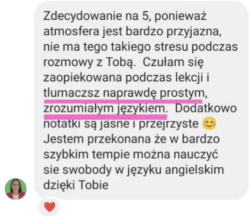 Nauczyłam mówić swobodnie kilkadziesiąt wyjątkowych osób. Co mnie bardzo cieszy, były to współprace długotrwałe, bo kursanci lubili się ze mną uczyć i przede wszystkim widzieli efekty! Zdobyte doświadczenie wykorzystuję tworząc dla Was szkolenia online oraz interaktywne materiały do samodzielnej nauki. Połączenie wiedzy na temat najskuteczniejszych metod nauki oraz najczęstszych wyzwań, z jakimi borykają się osoby uczące się, sprawia, że wielu osobom pomogłam zrealizować cel w postaci swobodnego mówienia po angielsku.